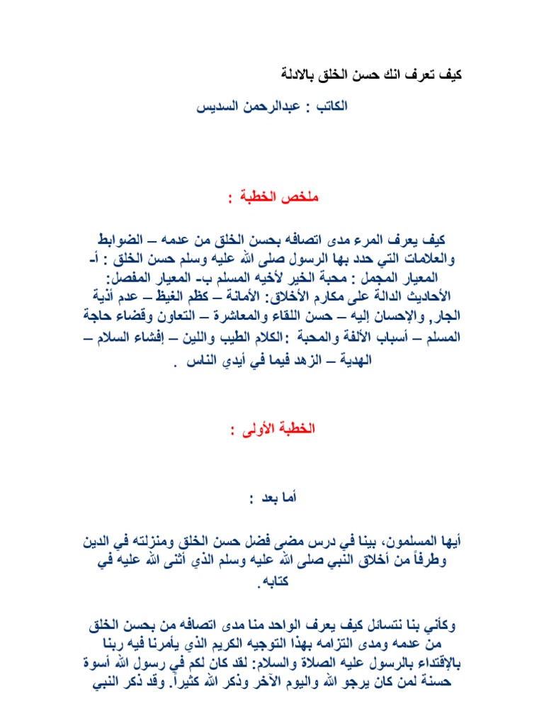 خطبة عن حسن الخلق. خطبة عن قوله تعالى ل ا إ ك ر اه ف ي الد ين ق د ت ب ي ن الر ش د م ن ال غ ي 21 مارس 2017. سئل الإمام أحمد رحمه الله تعالى عن حسن الخلق فقال. البعد عن الهجر والقطيعة والأعمال التي تورث العداوة والبغضاء يقول النبي صلى الله عليه وسلم. 1 عن إ ب ر اه يم ب ن الأشعث ق ال سمعت الفضيل ب ن عياض يقول إذا خالطت فخالط حسن الخلق فإنه لا يدعو إلا إلى خير وصاحبه منه في راحة ولا تخالط سيء الخلق فإنه لا يدعو إلا إلى شر وصاحبه منه في.